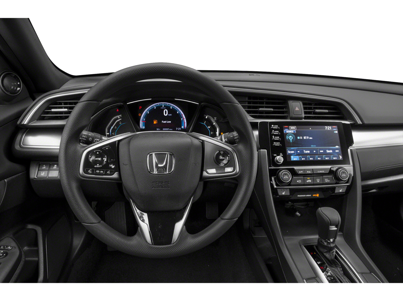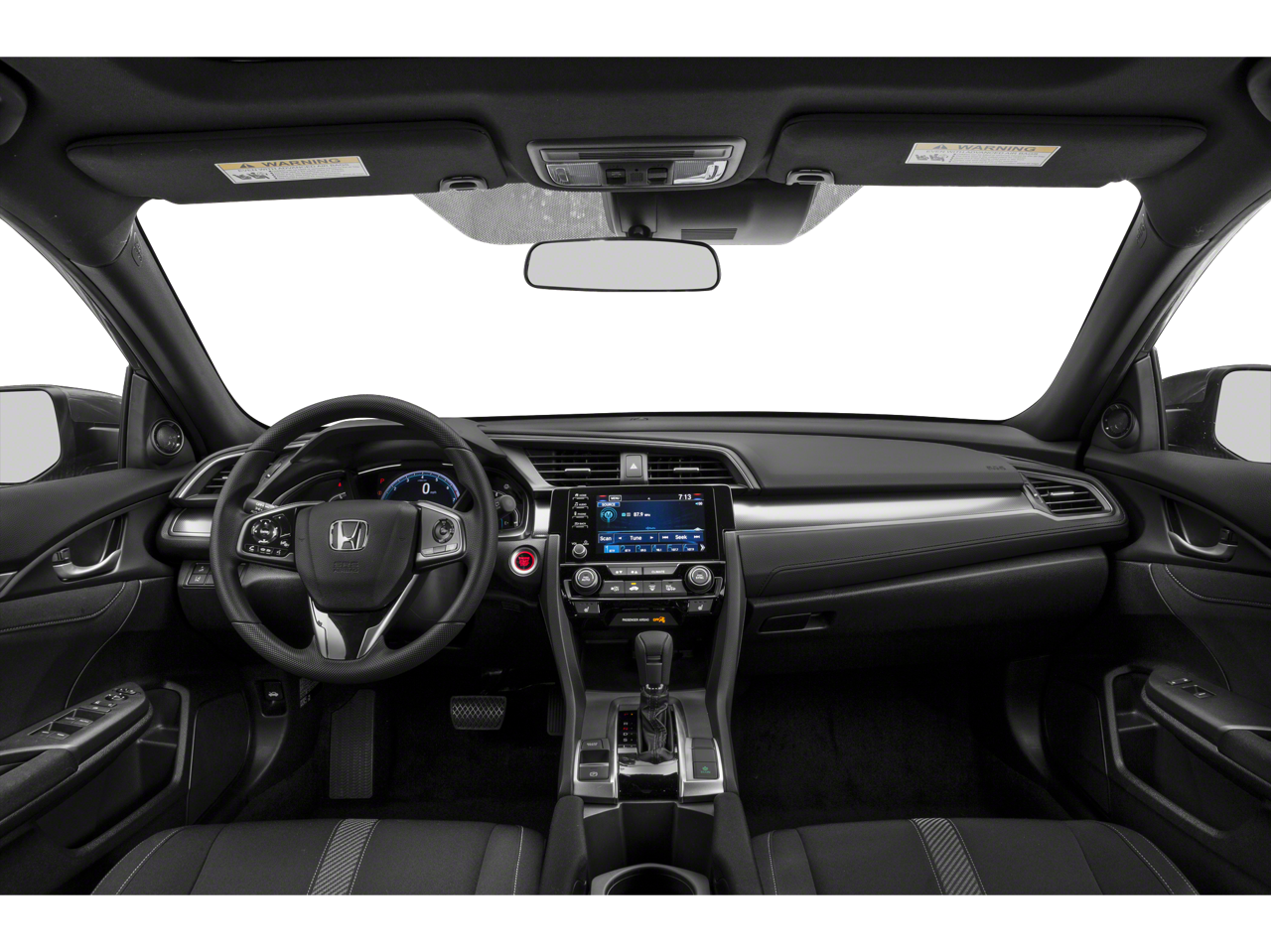 Black Cloth, 17"""""""""""""""" Alloy Wheels, 4-Wheel Disc Brakes, 8 Speakers, ABS brakes, Alloy wheels, AM/FM radio: SiriusXM, Apple CarPlay/Android Auto, Automatic temperature control, Brake assist, Bumpers: body-color, Delay-off headlights, Driver door bin, Driver vanity mirror, Dual front impact airbags, Dual front side impact airbags, Electronic Stability Control, Emergency communication system: HondaLink, Exterior Parking Camera Rear, Fabric Seating Surfaces, Forward collision: Collision Mitigation Braking System (CMBS) + FCW mitigation, Four wheel independent suspension, Front anti-roll bar, Front Bucket Seats, Front Center Armrest, Front dual zone A/C, Front fog lights, Front reading lights, Fully automatic headlights, Heated door mirrors, Illuminated entry, Low tire pressure warning, Occupant sensing airbag, Outside temperature display, Overhead airbag, Overhead console, Panic alarm, Passenger door bin, Passenger vanity mirror, Power door mirrors, Power moonroof, Radio data system, Radio: 180-Watt HD Audio System, Rear anti-roll bar, Rear seat center armrest, Rear window wiper, Reclining Front Bucket Seats, Remote keyless entry, Security system, Speed control, Speed-sensing steering, Split folding rear seat, Spoiler, Steering wheel mounted audio controls, Telescoping steering wheel, Traction control, Variably intermittent wipers.2019 Honda Civic EX
